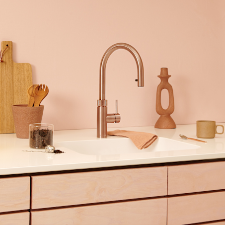 Disponible en chrome, inox, noir, gunmetal et cuivre rosé. À combiner avec le Quooker CUBE pour de l’eau fraîche et pétillante – la mise à niveau idéale pour une cuisine tournée vers l’avenir.