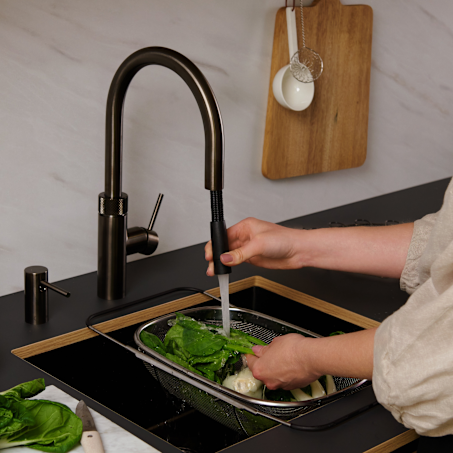 Le Quooker Flex délivre de l’eau bouillante à 100 °C en quelques secondes et dispose d’un tuyau extensible pour rincer facilement légumes et casseroles. Sécurisé, économe en énergie et élégant.