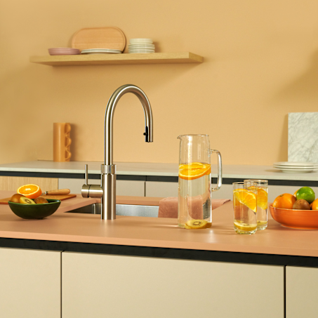Un seul robinet pour eau bouillante, chaude et froide, avec un flexible extractible pour une portée maximale. Combinez-le avec le module CUBE pour de l’eau fraîche et pétillante.